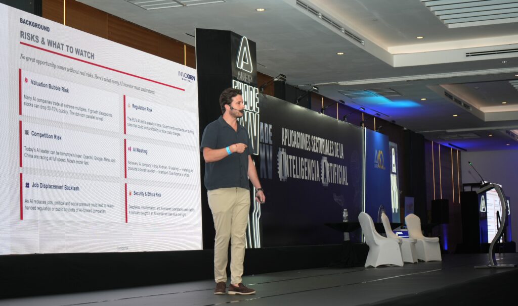 La ponencia detalló cómo la IA está reconfigurando sectores clave como la salud, finanzas, manufactura, educación, transporte y agricultura. En el ámbito financiero, Morán explicó que la IA es hoy una de las industrias más grandes y competitivas del mundo, con inversiones diarias de cientos de millones de dólares. Para las empresas, recomendó dos rutas de acción: la inversión en gigantes como Nvidia, Microsoft y Meta, o la inversión directa en empresas de forma privada.